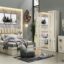 - Design : Style moderne et luxueux avec des motifs géométriques et des lignes épurées. La tête de lit présente un design symétrique avec des éléments rembourrés et des encadrements dorés. Les armoires et la commode ont des motifs circulaires dorés qui se croisent, ajoutant une touche distinctive. Présence d’éclairage intégré.